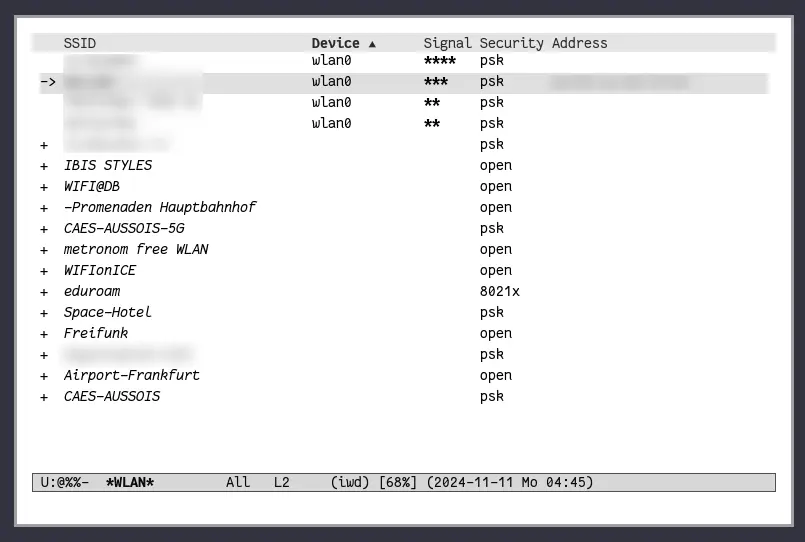 iwd.el↗ is an emacs major mode to to manage wireless connections using iwd↗ on linux.