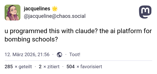 Going forward I will try even harder to avoid dependencies on other peoples projects where ever possible, to reduce the risk of indirectly endorsing an LLM infected project and therefore LLMs themselves.