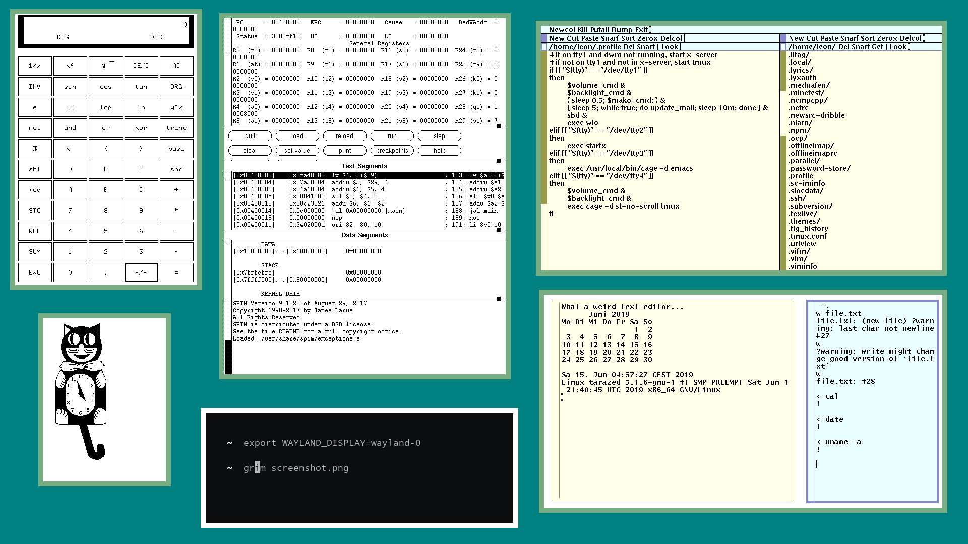 Finally on river. Also visible are wlclock, wayloadmon and wayneko. I had switched from vim to kakoune.