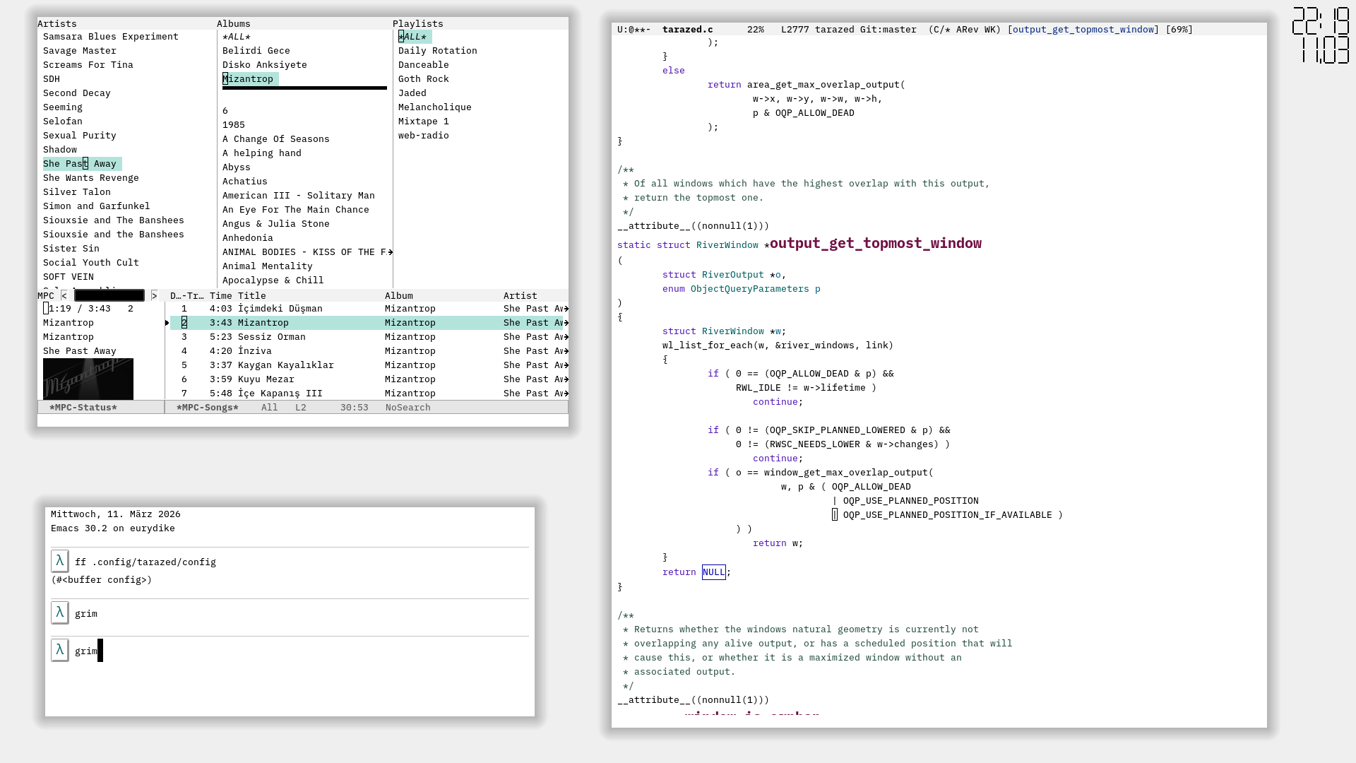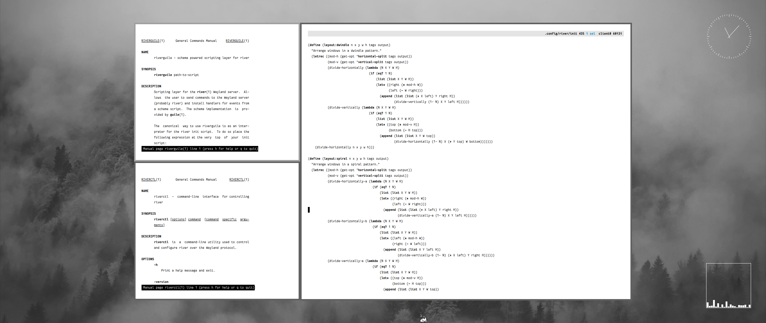 Currently using tarazed on river. Switched to emacs from kakoune. Still appreciate black-on-white text for my editor, but moved back to a traditional colour scheme for the terminal so I can tell the two apart easier at a glance.
