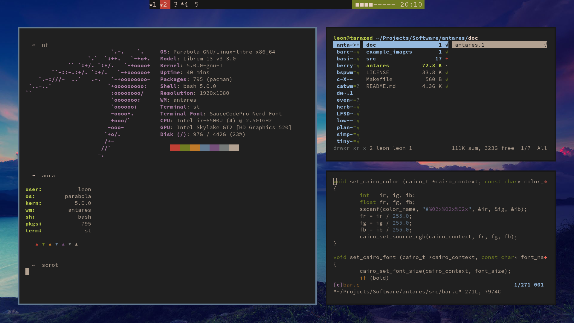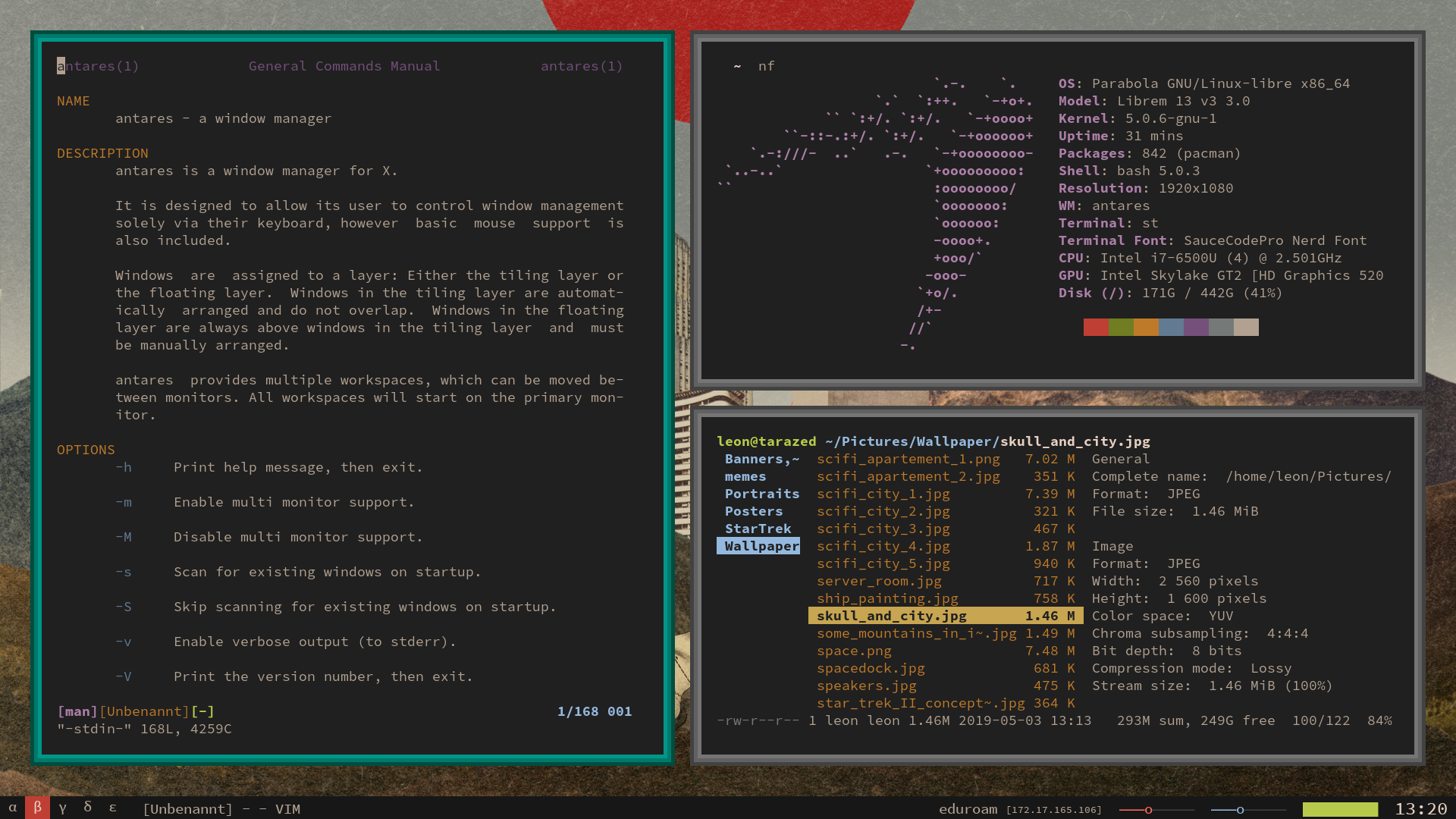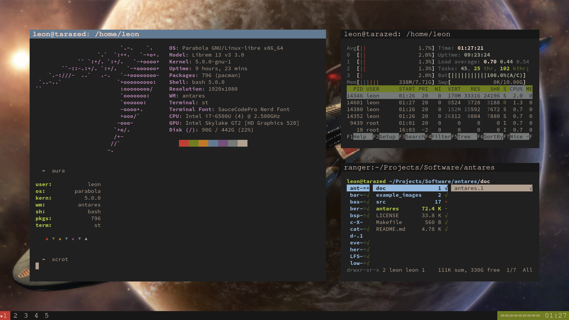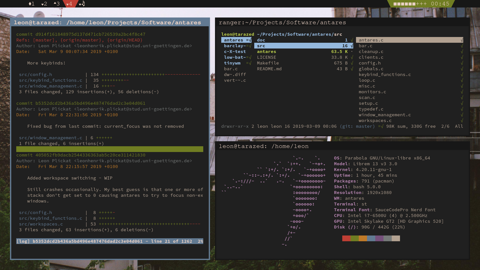 dwm with custom patches, ranger, st, self-made background tile.